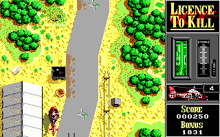 No primeiro nível, você controla um helicóptero. Mantenha-o acima da estrada porque você será destruído imediatamente se colidir com uma casa ou árvore. O inimigo atirará de pequenas casas cinzentas ou dos telhados. Atire neles ou apenas evite os seus projetéis. Você deve alcançar a entrada da base inimiga e deixar o Bond em algum lugar. Você verá uma pequena caixa com a palavra "JUMP" abaixo dela ao lado do seu helicóptero se você estiver na posição certa. Aperte o botão "FIRE", Bond irá para fora e você terminará a primeira tarefa.